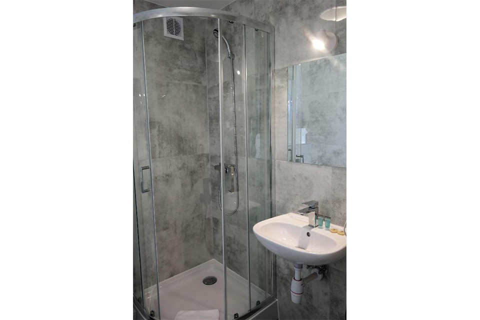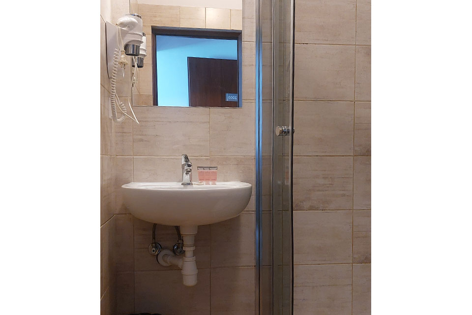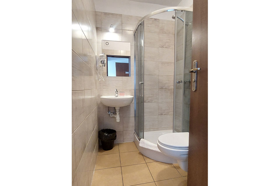 • Bathroom with shower cabin, hairdryer, and toiletries (shower gel and soap)