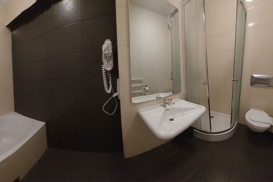 • Bathroom with a shower cabin and bathtub, hairdryer, and toiletries (shower gel and soap).